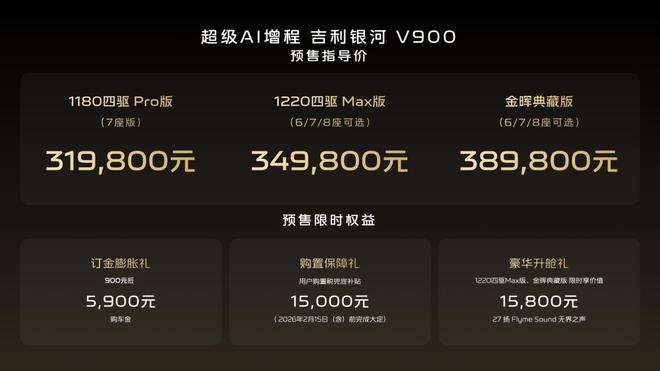 1月7日最新开启预售的吉利银河V900共推出三个版本车型,预售价格区间为31.98万元~38.98万元。