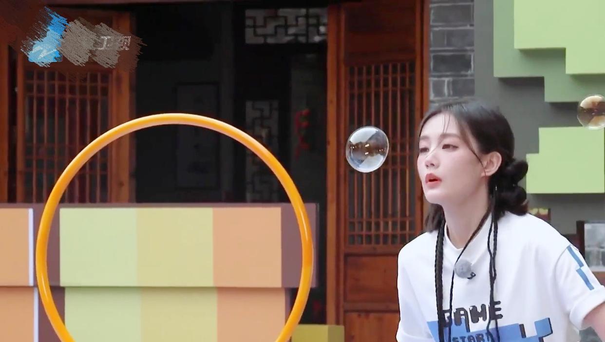 蓝队是第一个开始游戏的,李一桐开启第一棒,进行吹泡泡过环,不得不说李一桐的颜值确实高,不过面对吹出来的这些不听话的泡泡们,她很着急,忍不住用手大力挥舞,反复实验了好多次,每次都是差之毫厘,大家猜测和风向有一定的关系!几经崩溃过后,终于在规定的时间里成功完成!