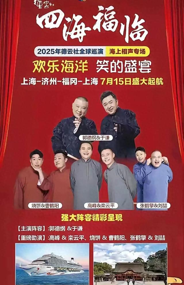 德云社网上的大海报已经发出来了,2025年7月15日德云社将举办“四海福临”全球商演海上相声专场,届时德云社参加商演的人员将同游客观众们一起搭乘国产大邮轮爱达魔都号从上海出发直至济州岛、福冈最后回上海,进行海上环游旅行在游轮上将精彩的相声节目带给游客。