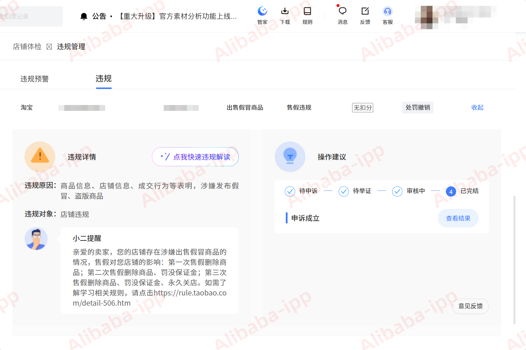 时间来到2023年,店铺里仅剩的一条Moncler围巾,作为多年前的库存老款,静静地躺在商品列表中。突然有一天,李薇收到了淘宝平台的后台通知,提示该商品因“涉嫌发布假冒、盗版商品”被信息层面排查。系统判定依据是“商品信息、店铺信息、成交行为等”存在异常。这对李薇而言无异于晴天霹雳。处罚结果清晰而严厉:商品链接将被删除,店铺面临降权,未来一系列推广活动也将受限。这对一个靠流量和信誉生存的代购店铺来说,打击可能是致命的。
