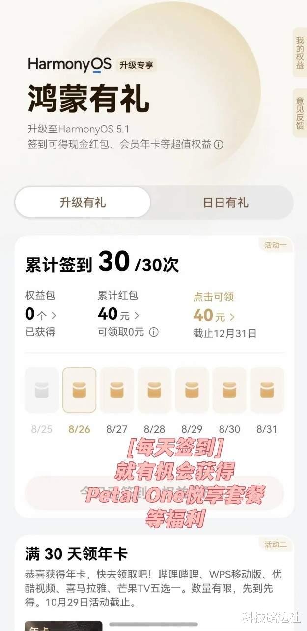 说到这个200GB的空间,其实还有一个省钱小窍门。我把手机升级到最新的鸿蒙5.1,桌面右滑到负一屏,点击“鸿蒙有礼”,就能进入福利页:每天进去签到打卡,就有机会抽中各种好礼,其中就包括3个月的Petal One悦享套餐,里面就包含了200GB的云空间会员。等于说,有机会免费享受到我刚才说的这一切。