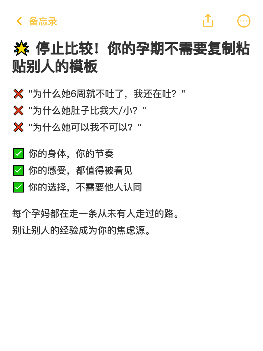 没有两个人的孕期是完全一样的。孕吐程度、肚子大小、心情起伏...都是你和宝宝独特的信号。别让别人的标准绑架你,也别拿自己的经历去评判他人。你需要的不是完美的答案,而是温暖的理解和支持。❤️