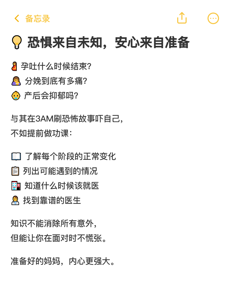 恐惧,往往源于未知。与其胡思乱想,不如主动学习!提前了解孕早、中、晚期的变化,分娩的流程,产后可能的情绪波动... 当你把“未知”变成“已知”,把不确定性变成一个个清晰的checklist,会发现自己内心强大了不止一点点。✅