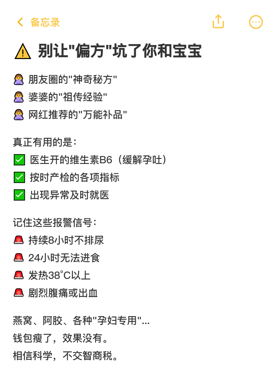 孕吐难受到怀疑人生?别乱信偏方,维生素B6+多西拉敏是经过医学验证的有效方法。与其砸钱买一堆昂贵的“智商税”补品,不如踏踏实实做好每一次产检。学会识别腹痛、见红等关键的“报警信号”,及时就医,这比什么都重要。