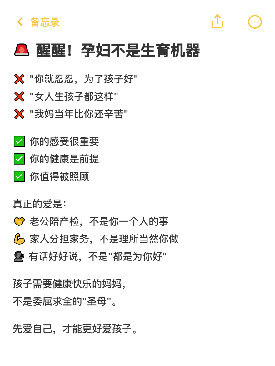 你不是一个行走的子宫,你首先是你自己。身心健康永远是Top 1!请勇敢地告诉家人和“猪队友”你的需求,拒绝“丧偶式产检”,拒绝“多喝热水式”的关心。真正的爱,是陪你产检、帮你分担、听你倾诉的实际行动。快@他进来抄作业!