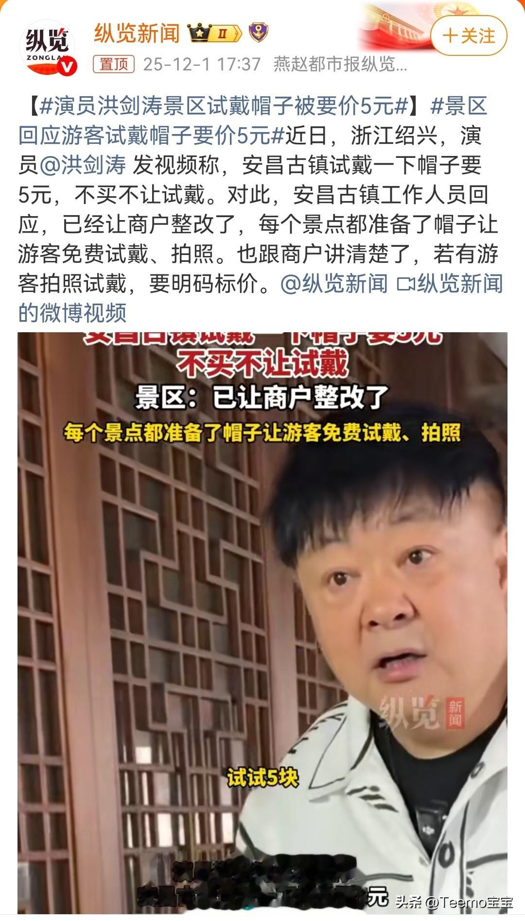 而近日演员洪剑涛就发布了一则视频称在安昌古镇游玩时,想要试戴一下帽子,原本看似很平常的事,因为一般的店都会允许顾客试戴,觉得满意再付款。