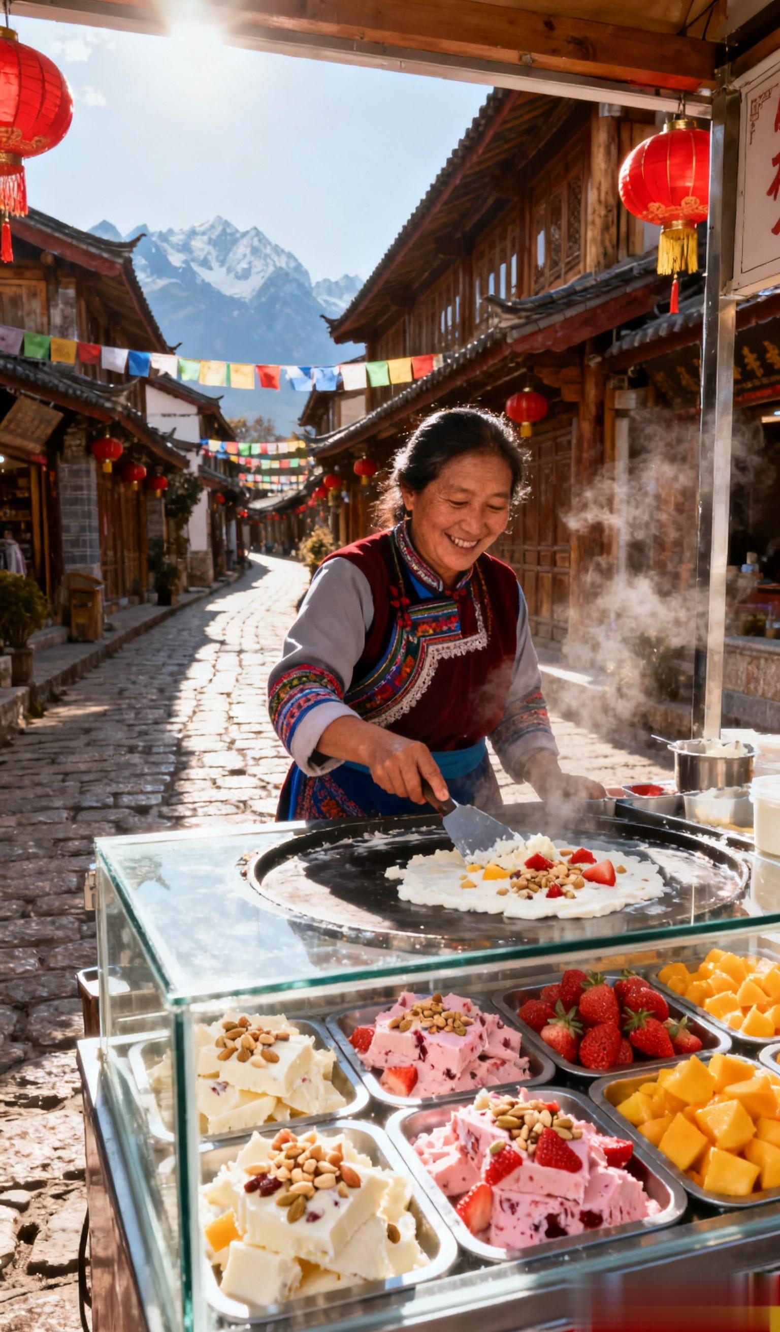 但唯一让我印象深刻的是,我们一天下午吃了饭在古镇游玩,老公看到了一家卖炒酸奶的店,于是想买一盒尝尝,刚好走到店门口,询问老板多少钱一盒,老板回答25,我们愣了一下,没想到这个价格还是有些贵。