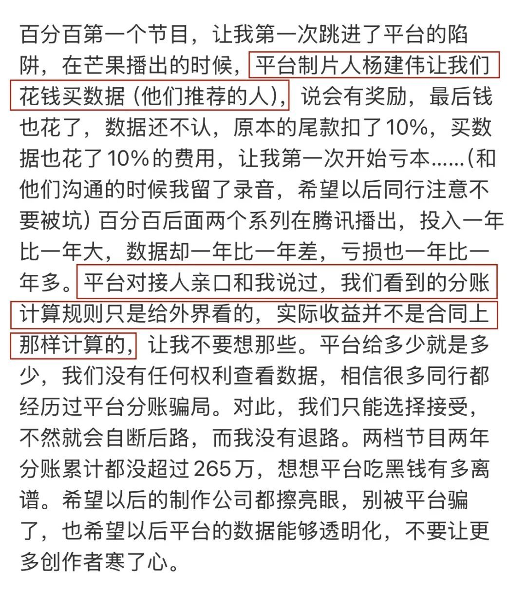 针对芒果TV,羊羊羊指控在《百分百》系列首档节目《百分百开麦》播出期间,平台制片人杨建伟曾要求其“花钱买数据”,并承诺给予相应奖励。但多花10%的钱买数据后,平台不仅未认可该数据,还扣除了10%的尾款,相关费用均由制作方承担,这直接导致他“第一次开始亏本”。