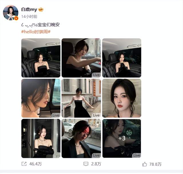根据白鹿发文,照片中的她身穿一袭黑色抹胸礼裙,脖子上带着一个很有特点的银色项链,双手还带着黑色的皮质手套,整体搭配看起来高贵又优雅。