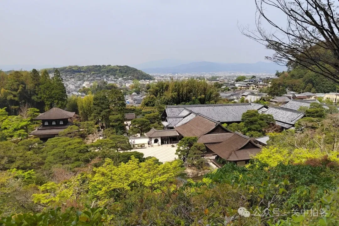 顺着水流,拾级而上,登临东侧的山坡,俯瞰银阁寺全貌。跟金碧辉煌的金阁寺相比,银阁寺好像静谧的世外桃源,淡雅简洁,超凡脱俗。可惜,除了银阁和东求堂外,其他建筑均为江户时代重建。
