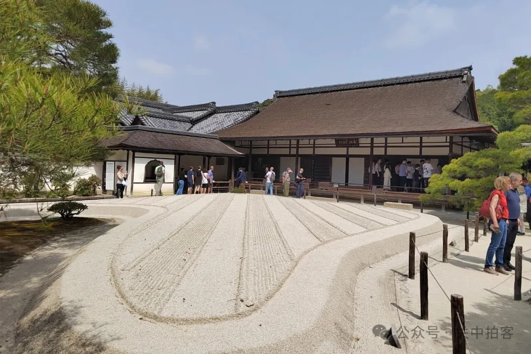 在寺院的北边正中间,矗立着方丈殿,也称“本堂”。在大殿的南侧,铺满白色砂砾,将光线反射入殿内,形成一座枯山水庭园。在砂砾表面,勾勒出线条,好像一道道水波,被称为“银沙滩”。