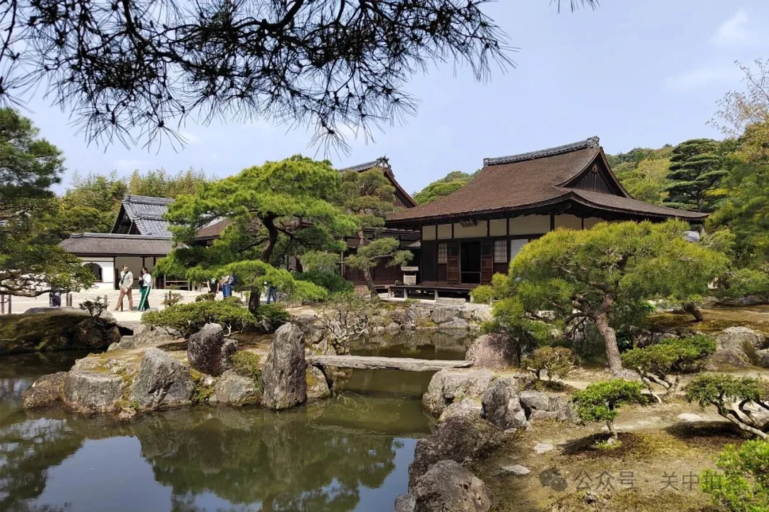 走进山门,沿着寺墙,转向南侧的中门,购票进入寺内参观。这里以锦镜池为中心,殿宇楼阁临水而建,布局紧凑,曲径通幽。观音殿坐落于西南侧,模仿鹿苑寺金阁修建,曾经计划贴银箔装饰,因而得名“银阁”。