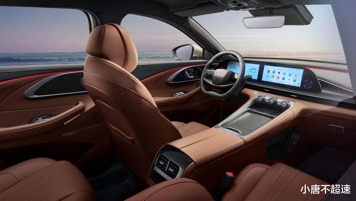 内饰部分,12.3英寸液晶仪表+12.3英寸中控屏组成了双联屏,搭载高通骁龙8155芯片及Lion 5.0雄狮智云系统,支持智能语音交互、苹果CarPlay、华为HiCar及萌驾手机互联,而副仪表台保留了实体空调旋钮,并配有50瓦手机无线充电面板。车内为5座布局,前排主副驾驶座椅是电动调节,具有座椅加热和通风功能。