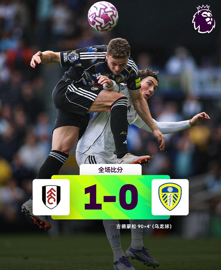 富勒姆与利兹联的保级大战上演戏剧性一幕。全场占优的利兹联由勒温、阿伦森多次制造威胁,却始终未能破门。战至第93分钟,古德蒙松不幸自摆乌龙,助富勒姆1-0绝杀对手。这场胜利让富勒姆跳出降级区,而利兹联则遭遇三轮不胜。