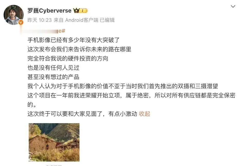 其中还提到# 荣耀aimage #标签,结合以往的信息来看,这应该是在预告荣耀 AiMAGE 影像“绝密”项目即将亮相。