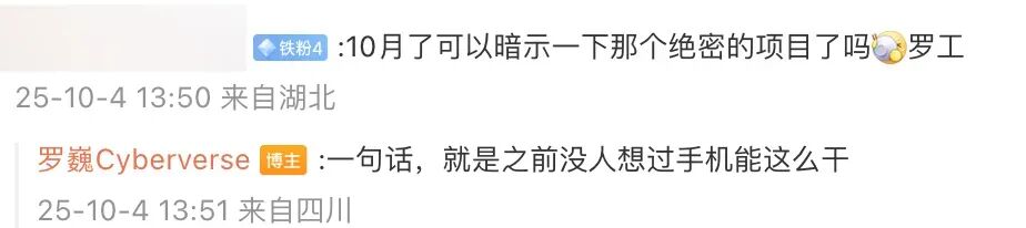 近日,有网友再次询问“10月了可以暗示一下那个绝密的项目了吗”时,罗巍表示“一句话,就是之前没人想过手机能这么干”。