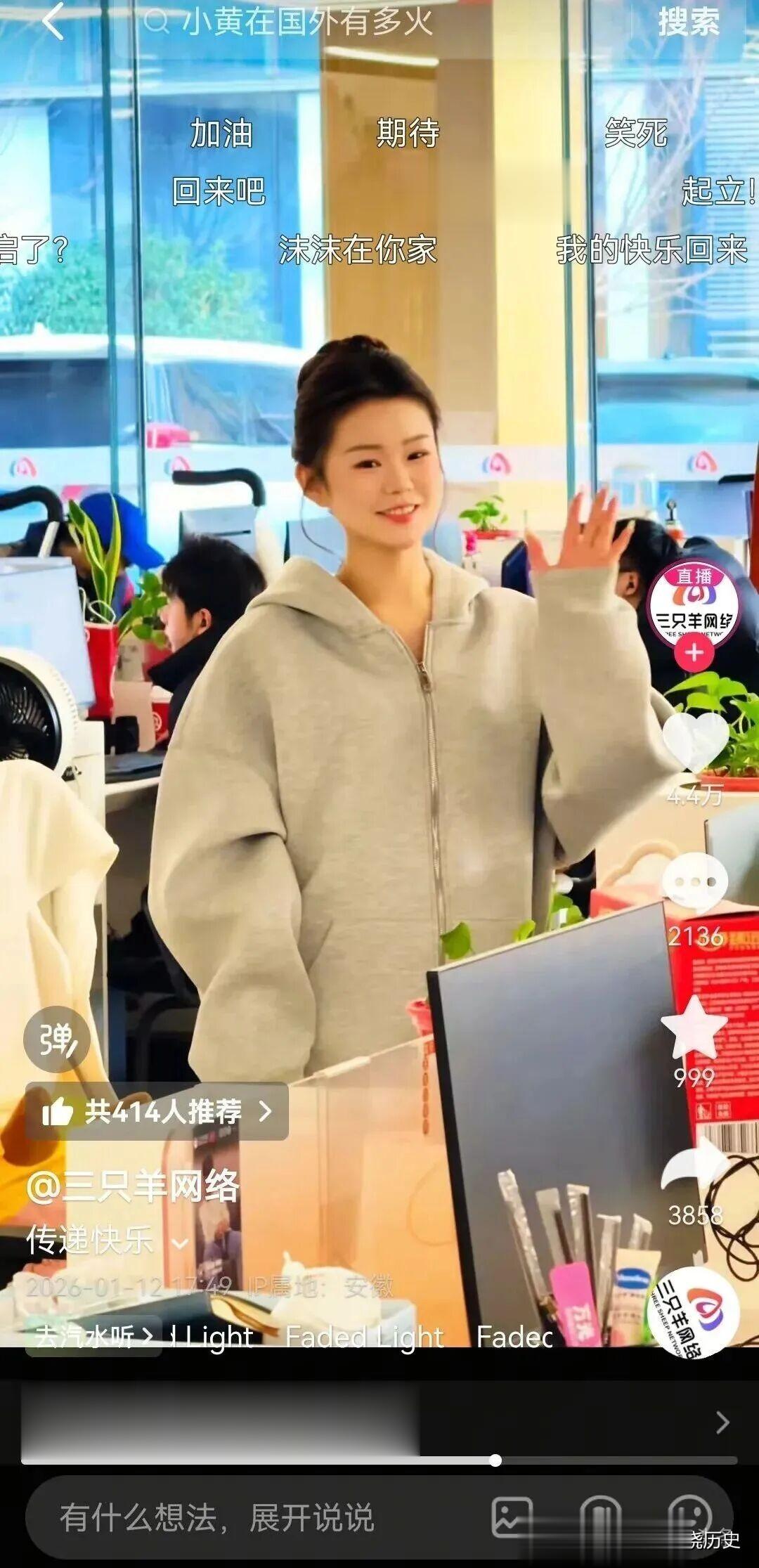 值得一提的是,除了@三只羊网络开播外,三只羊旗下的众多主播也开始在抖音活跃了起来。其中,@三只羊网络在1月12日发布了一个视频,视频中出现了众多三只羊的主播,并配文“传递快乐”。