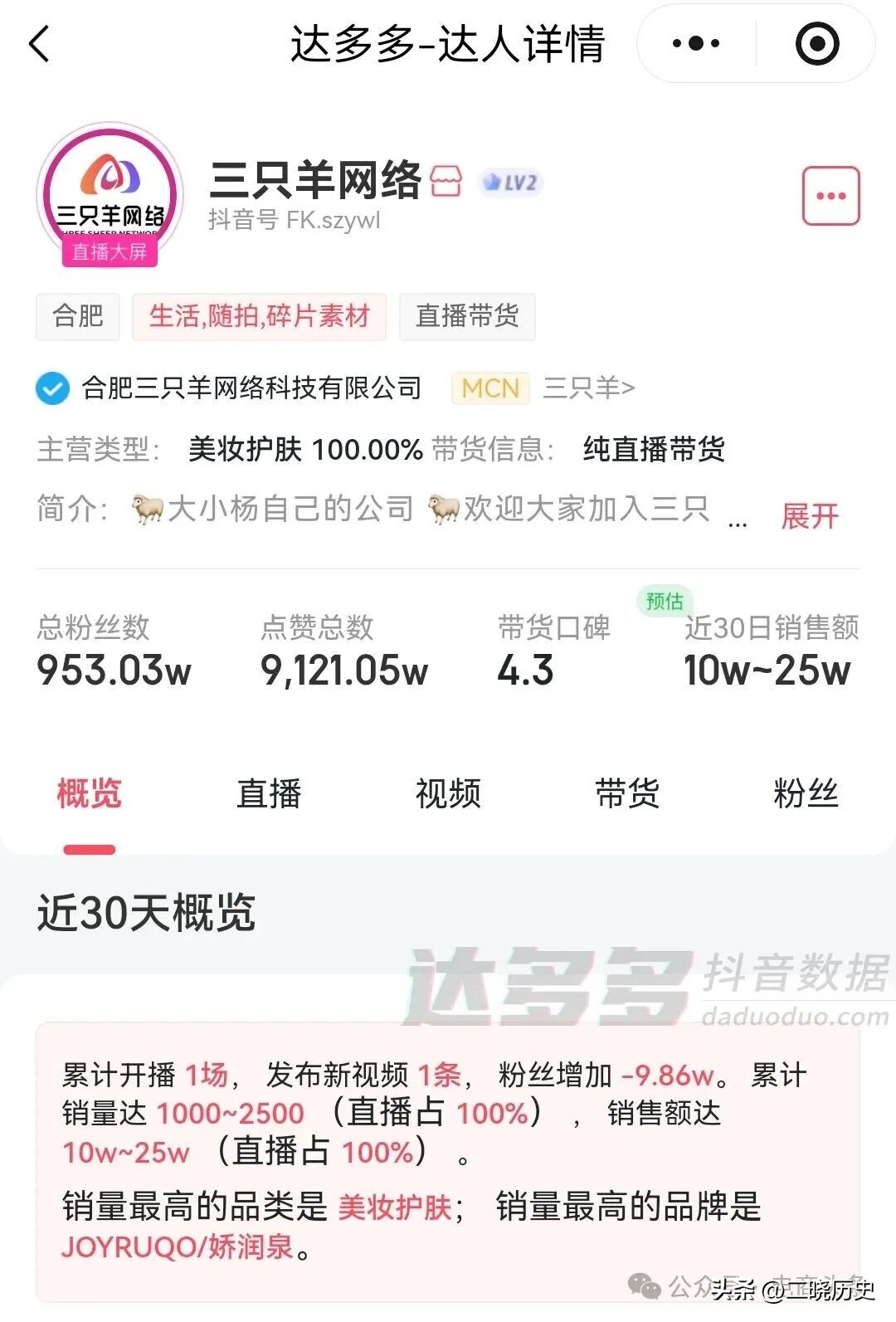 本场直播主要由三只羊旗下主播小乔进行,带货品类主要为第三方美妆品牌。达多多数据显示,本场直播持续4小时,观看人次达到41.98万,销量在1000到2500之间,销售额在10万到25万之间。