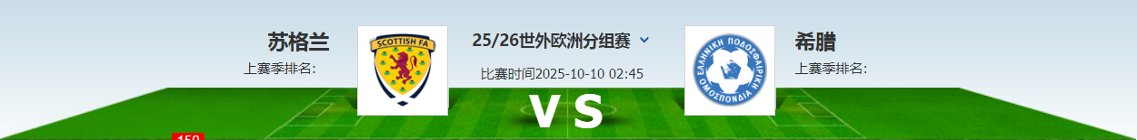世界杯欧洲区预选赛C组第三轮即将开始,本场比赛由苏格兰迎战希腊。苏格兰前两场比赛1胜1平;希腊则是1胜1负拿到三分,暂时排在小组第三位。