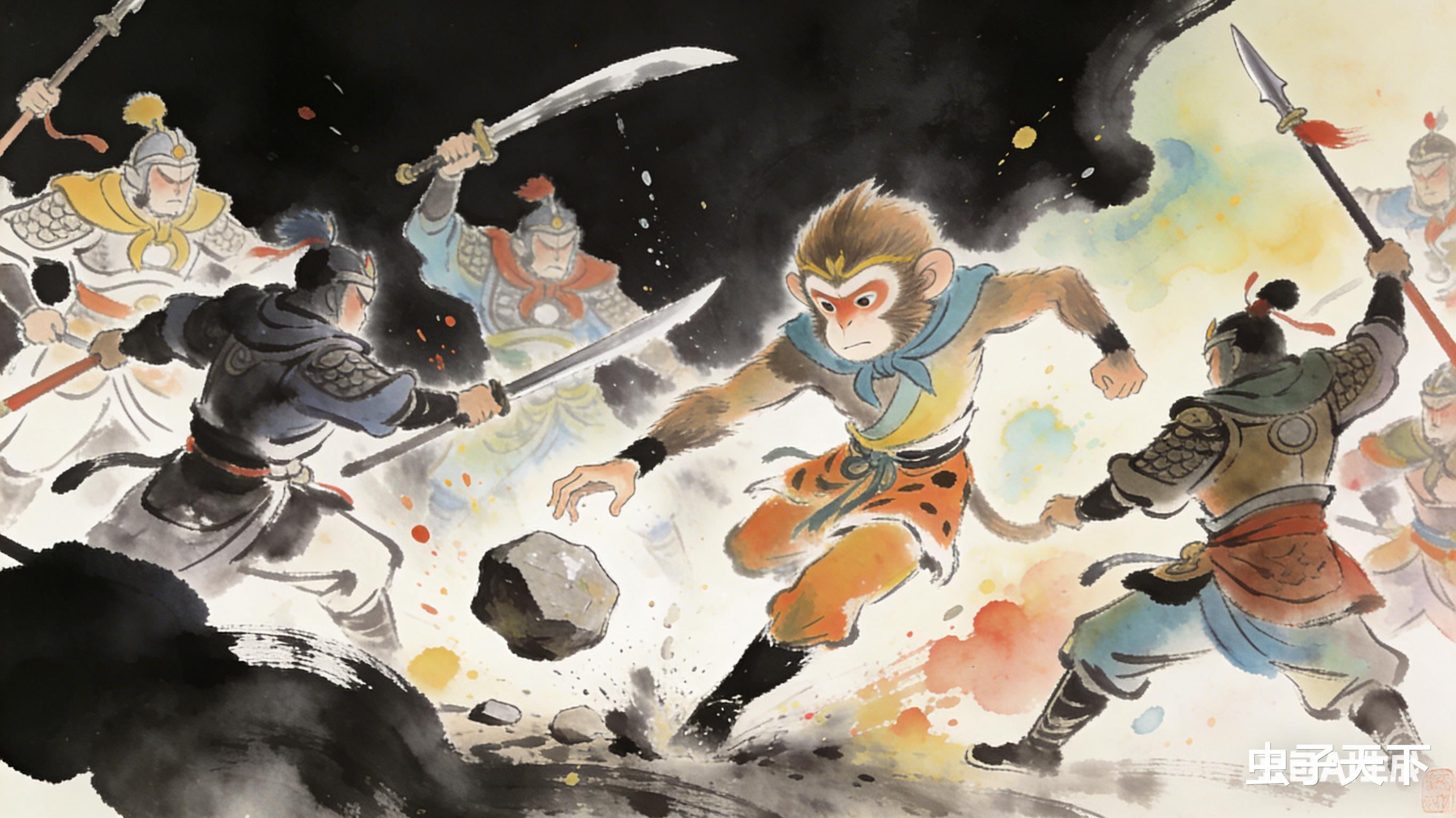 石猴身手敏捷,左躲右闪,还捡起石头砸退了几个天兵。