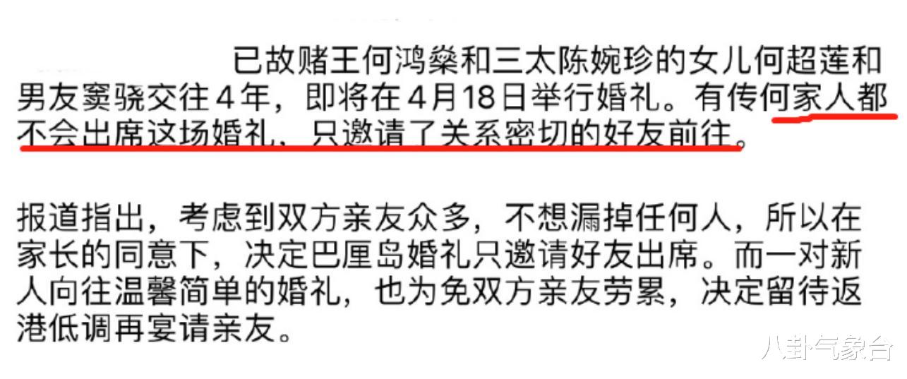亲戚则由新人回港后再另席招待,因此三太以及何超云、双胞胎弟弟何猷启都不会来巴厘岛参加这场婚礼。