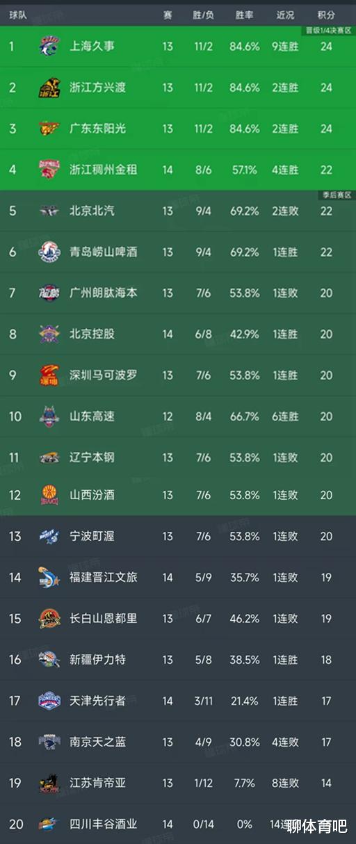 北京时间1月12日,今晚的CBA常规赛率先结束了3场比赛,我们看看最新积分榜的变动,主要的信息如下:浙江稠州103-68