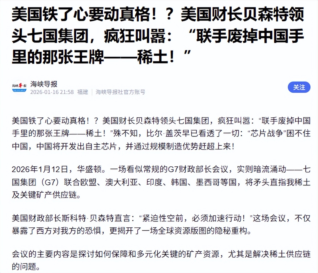 2026年1月12日,G7国家在美国华盛顿召开稀土合作共识会议,其中澳大利亚和印度等G7盟友业参与其中,但有关会议结果却没有发出什么正式联合声明。