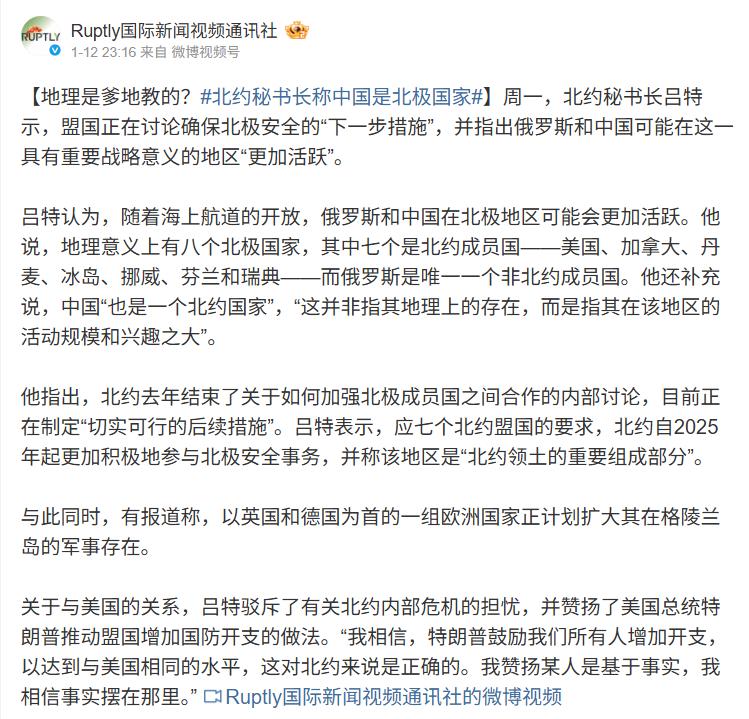 有意思的是在同一天时间,北约秘书长吕特公开宣称,中国也算是北极国家,明显是想要将中国拉入格陵兰岛问题里去,对美国形成制衡。