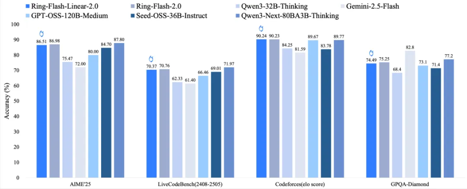 今天,我们进一步开源了该系列模型的升级版本Ring-flash-linear-2.0-128K。相较于之前的Ring-flash-linear-2.0版本,我们将其上下文窗口进一步扩展至128K,并通过 SFT 与强化学习的稳定训练,使模型在各项高难度复杂推理任务上均达到了 SOTA 表现。与之前的 32K 模型版本相比,Ring-flash-linear-2.0-128K更适合用于超长文本的代码编程以及 agent 等场景。