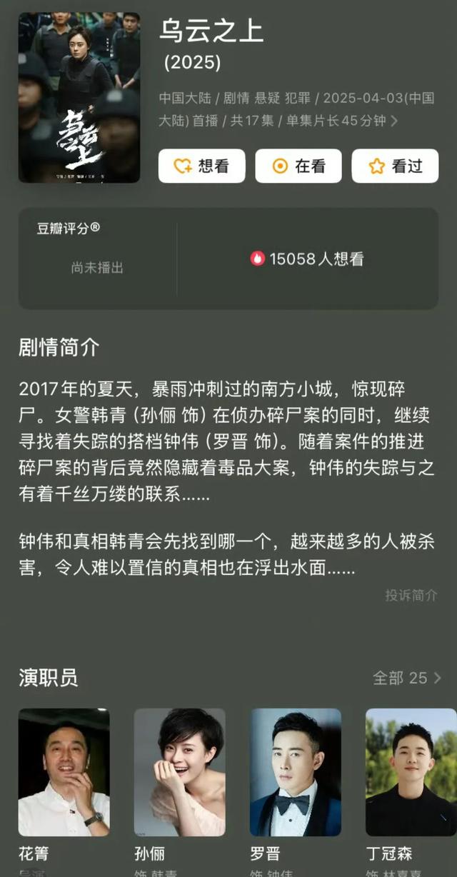 除了紧张刺激的剧情外,《乌云之上》的演员阵容也是一大亮点。孙俪作为实力派女演员,凭借出色的演技和独特的魅力,赢得了无数观众的喜爱。此次她饰演的韩青一角,不仅形象鲜明,而且性格复杂多变,对演技有着极高的要求。罗晋则饰演失踪的警察钟伟,他的角色身份扑朔迷离,为剧情增添了更多的悬念和反转。丁冠森和李小冉等演员也将在剧中扮演重要角色,共同为观众呈现一场精彩纷呈的悬疑盛宴。