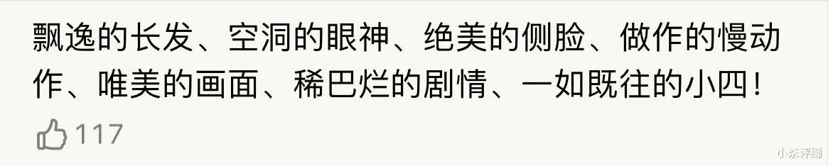 飘逸的长发,空洞的眼神,绝美的侧脸,做作的慢动作,唯美的画面,稀烂的剧情。
