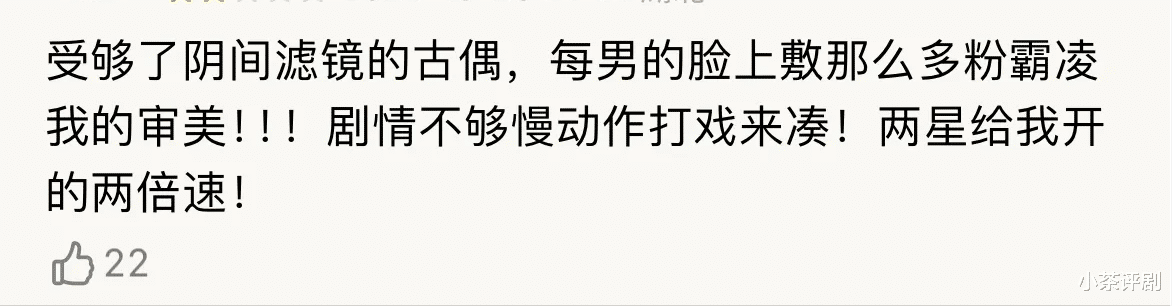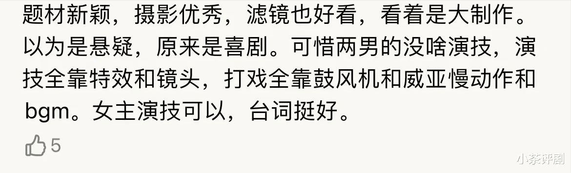 演技啥的我看不出来倒不评价了,就是那个说话速度太慢了很难受,开1.25倍速又显得快了些