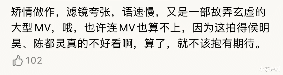 矫情做作,滤镜夸张,语速过慢,又是一部故弄玄虚的大型MV,或者说连这都算不上,因为并没有拍出演员的美。