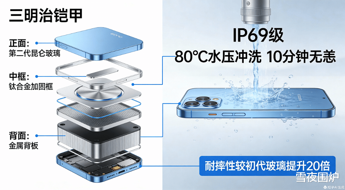 结构重组:刚柔并济防护第二代昆仑玻璃(正面)+ 钛合金加固框(中框)+ 金属背板(背面)构成“三明治铠甲”。IP69级抗高温高压喷水认证(80℃水压冲洗10分钟无恙),耐摔性较初代玻璃提升20倍。