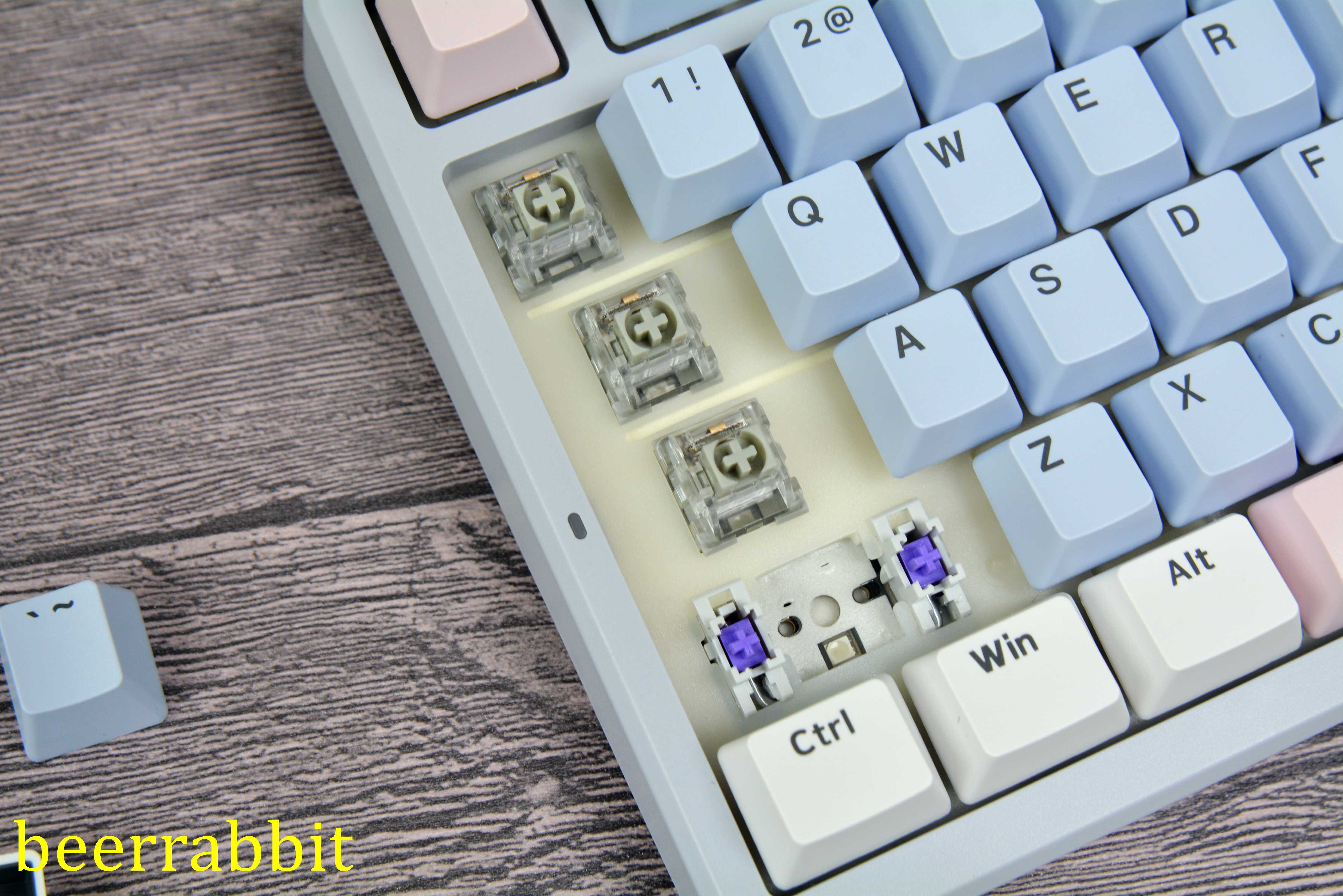 PBT 含量更高的双色注塑键帽带来了更鲜艳的色彩及更出色的材质表现。键帽高度为 OEM 标准,上手无需适应。细磨砂触感干爽,水口藏在键壁下缘,强迫症友好。