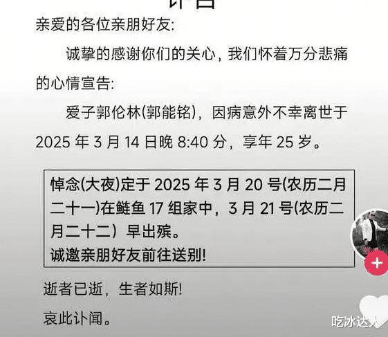 字里行间,我们得知郭伦林的离世源于一场意外,却未透露更多细节,徒留一片空白,任由人们猜测与遐想。这空白,如同一道深深的裂痕,将生与死隔绝开来,也让这份悲伤更加沉重。