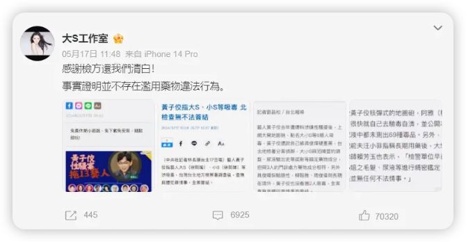 在春意盎然的5月,大S家的连续剧又添新篇章。5月17日,随着大S的健康检查报告公布,她带着一种难以掩饰的喜悦,在微博上洋溢着“我很干净”的自豪。她的文字中流露出对公正的感激:“感谢检方还我清白!”仿佛是春风拂过,带来了清新的气息。