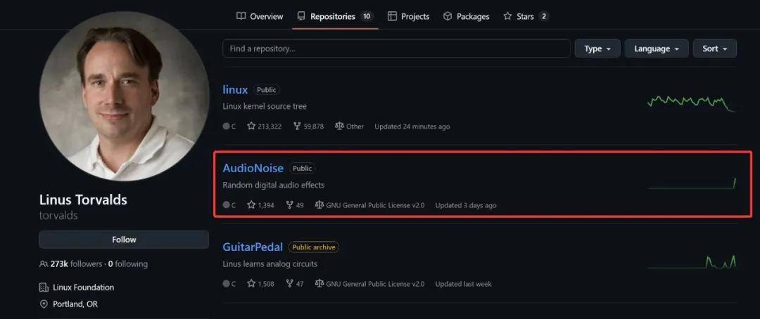 大神在 GitHub 上发布了一个名叫 AudioNoise 的新项目,和 Linux 并列。