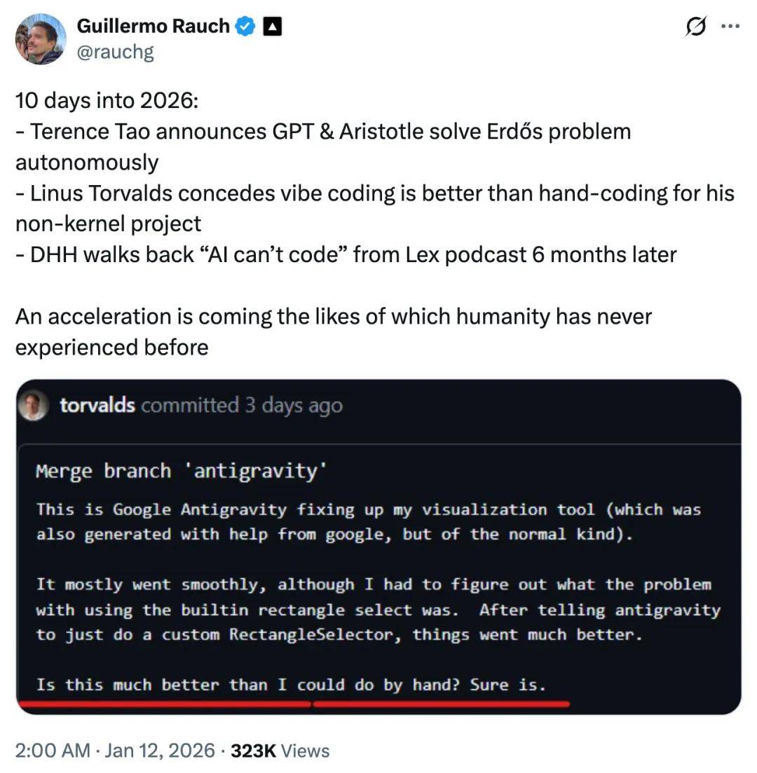 云开发平台 Vercel CEO Guillermo Rauch 列举了 2026 开年发生的几件大事,其中 Torvalds 在其非内核项目中使用氛围编程与陶哲轩宣布 GPT 和 Aristotle 自主解决 Erdős 问题、编程大神 DHH 收回在 Lex 播客中发表的「AI 不会编程」的言论等并列。