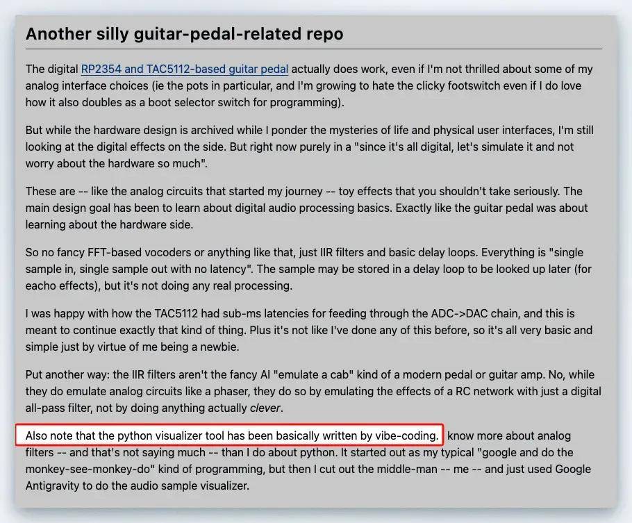 在自述文件中,Torvalds 说这是一个和吉他效果器相关的代码库,「这些效果器在利用 AI 技术『模拟箱体』…… 另外需要注意的是,这个 Python 可视化工具基本上是用 Vibe Coding 的方式编写的。」