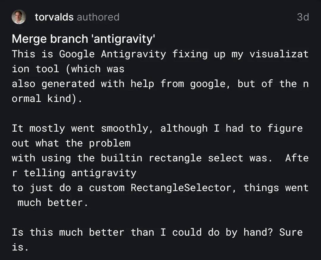 Antigravity 创建者、谷歌 DeepMind 工程师 Varun Mohan 视 Torvalds 为自己的编程偶像之一,此次对其能够在最新的项目中使用该 AI 编程工具感到莫大的荣幸。