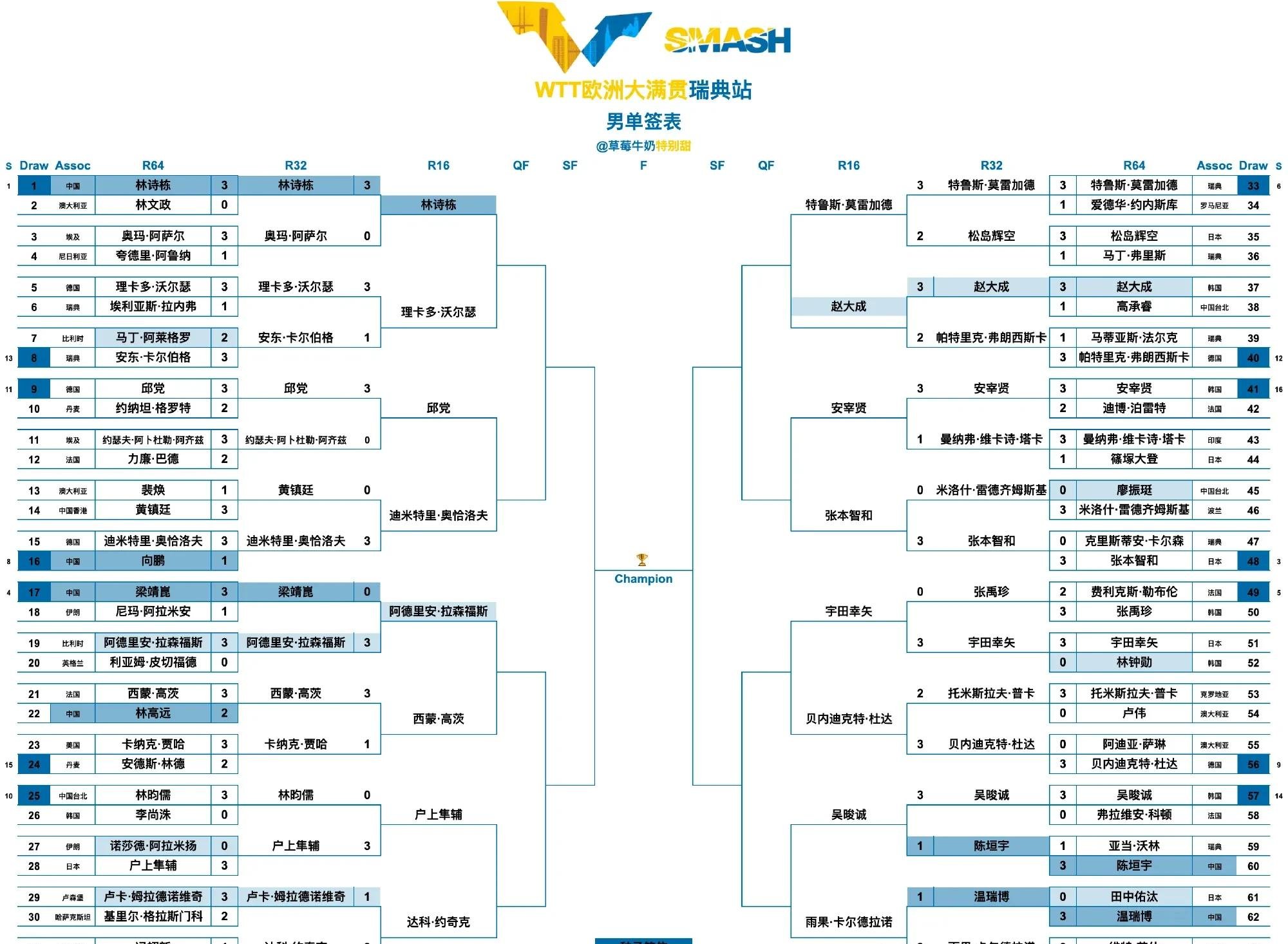 欧洲大满贯第7个比赛日结束男女单打1/16决赛,男女双打1/8决赛及混双1/4决赛,男单16强全部产生,国乒剩林诗栋一根独苗。德国队队员本站比赛表现出色,5人参赛,4人晋级16强,日本队、韩国队各有三人晋级16强。主场作战的瑞典队派出多名选手参赛,剩莫雷加德一根独苗。