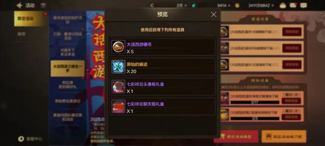 6、新版本缘生一梦活动。完胜剧情任务之后,可以获得一个礼包,里面包含大话西游硬币、20个原始的痕迹。