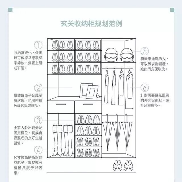 家里的鞋子有不同种类的,比如平底鞋、靴子、高跟鞋、儿童鞋等,那么我们就要注意鞋柜的高度、长度的设计来满足不同鞋子的高度需求。