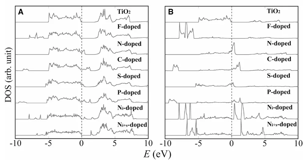 Asahi等的经典研究通过能带结构对比,进一步证实N掺杂引入的浅能级态可捕获光子能量并激发电子跃迁,为TiO₂的可见光响应提供了理论依据。