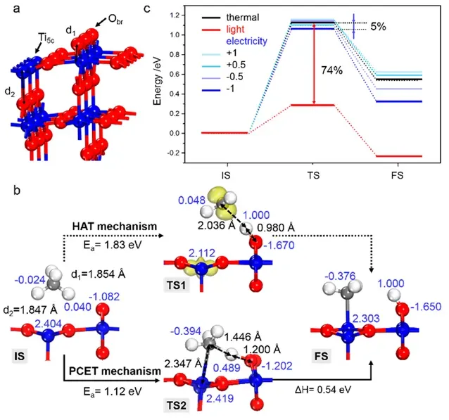 反应起始于H₂O分子在TiO₂表面的吸附活化,随后经历三步关键基元反应:第一步H₂O解离为OH与H⁺+e⁻,自由能变化(ΔG)为1.2eV;第二步OH进一步解离为O与H⁺+e⁻,ΔG=0.8eV;第三步O与H₂O反应生成OOH并释放H⁺+e⁻,此步骤 ΔG=1.5eV,为整个水分解路径的决速步骤(RDS)。