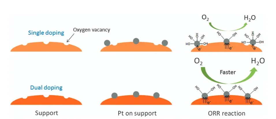 在双金属位点协同体系中,Zr⁴⁺掺杂TiO₂的理论计算表明,该过程的形成能为-3.2eV,热力学上呈现自发趋势,促使相邻Ti³⁺对的形成。