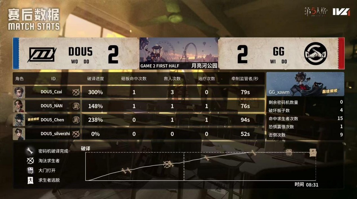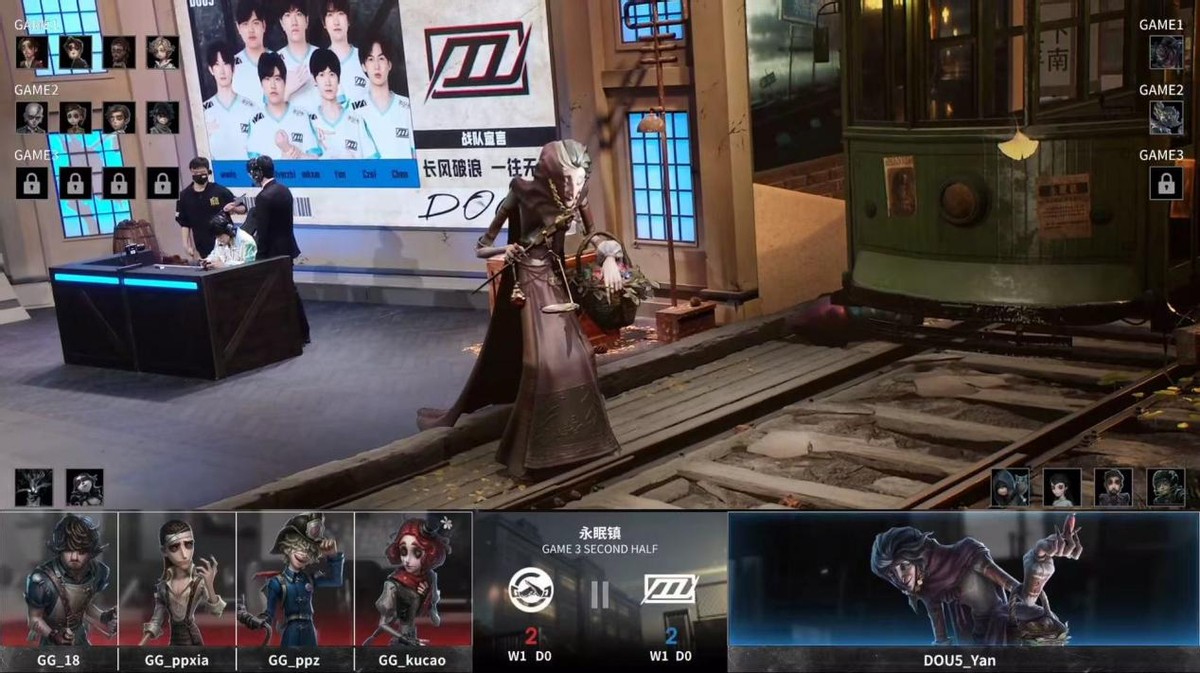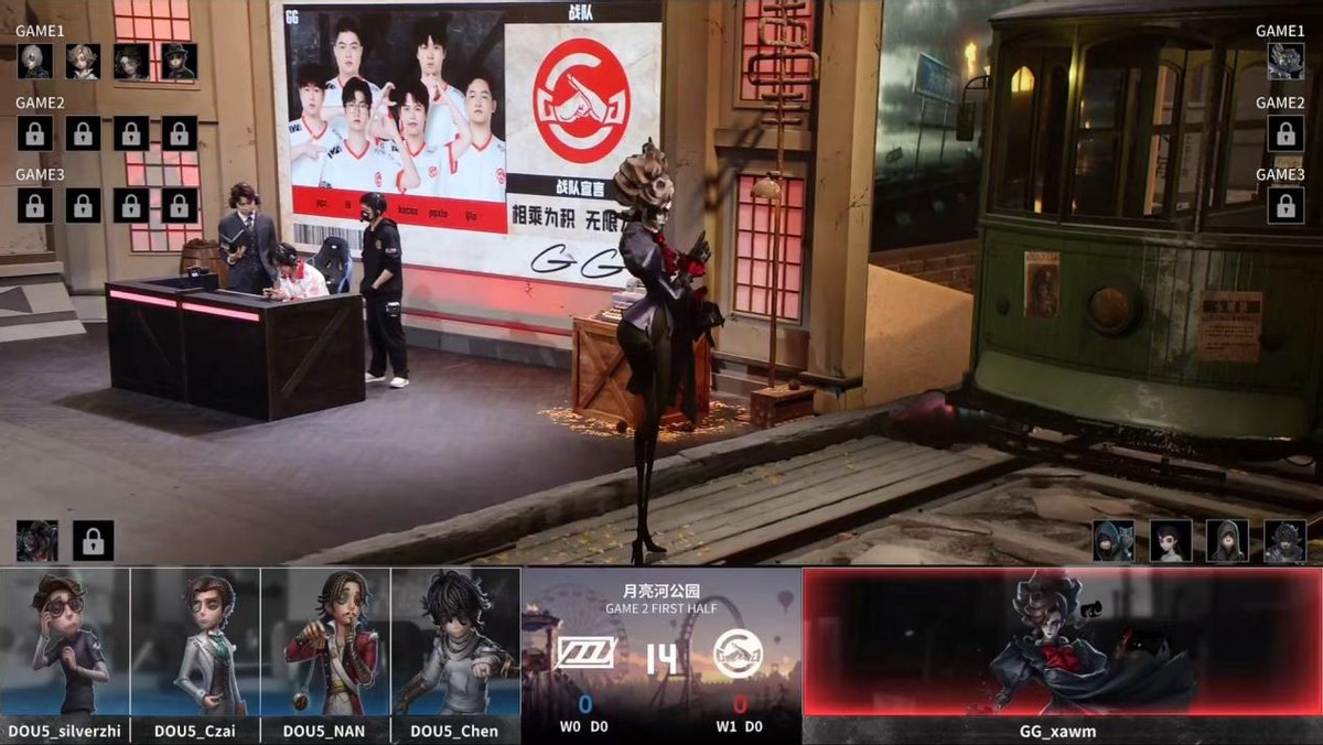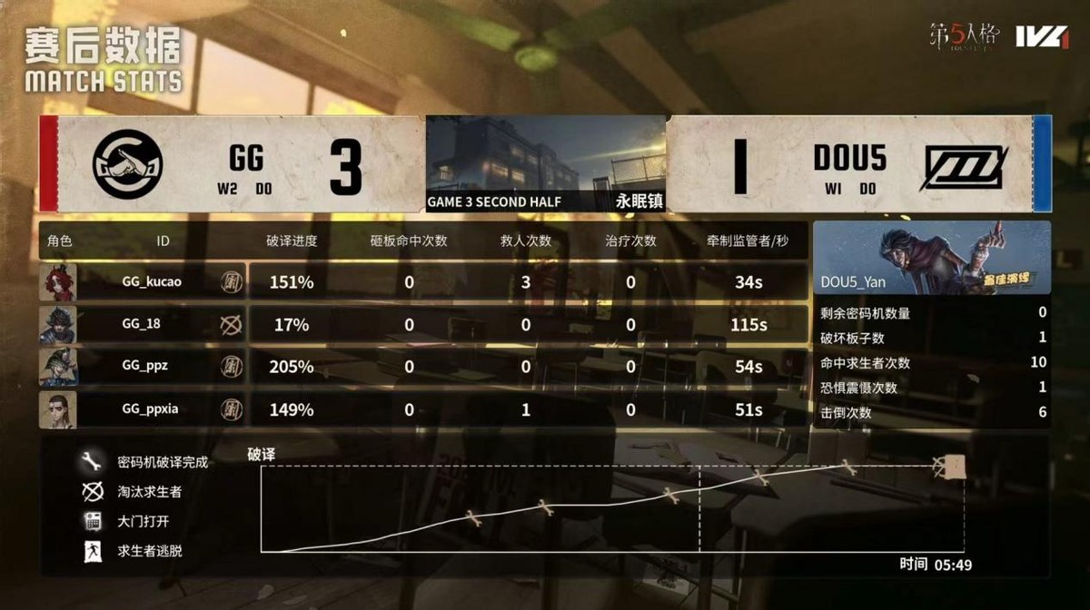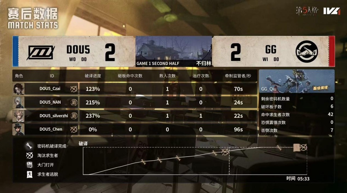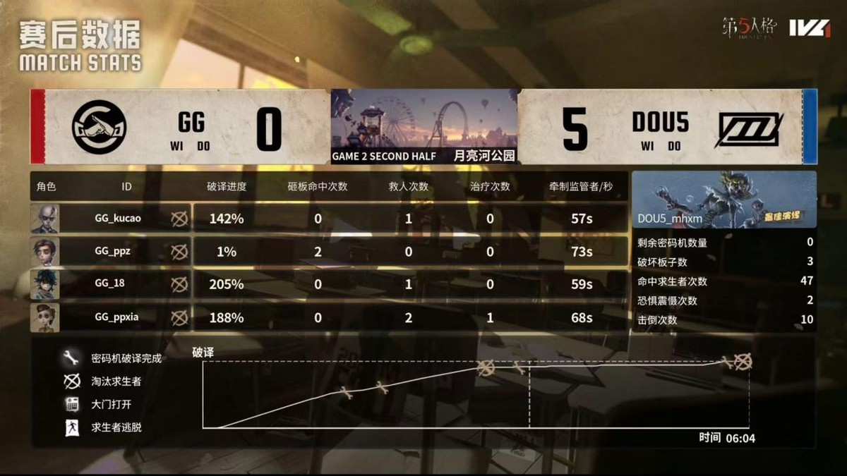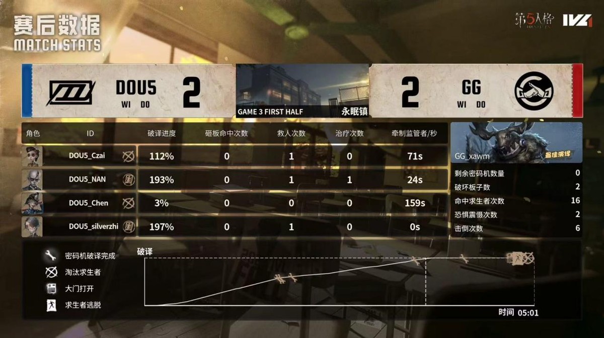 DOU5的求生者选择了入殓师、空军、“逃脱大师”、火灾调查员(BAN“跛脚羊”、破轮);成都GG的监管者xawm选择了鹿头。(BAN先知、机械师、祭司、飞行家)
