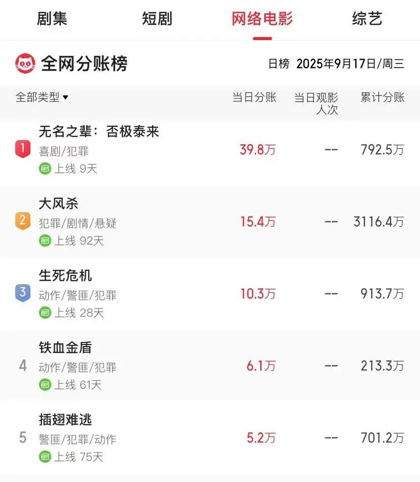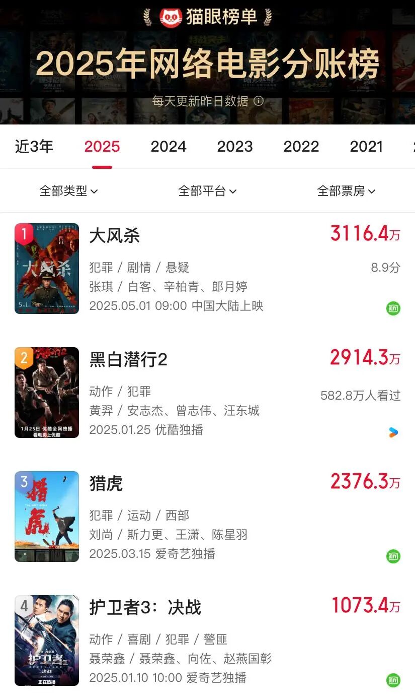 《无名之辈2》并不是第一部受益的院线电影,今年以来,网端分账收益破千万的电影中,位列TOP1的《大风杀》、也是唯一一部分账超3000万的影片,该片就是一部院线电影。