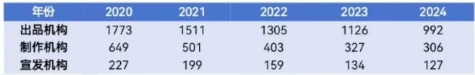 国家广播电视总局监管中心的数据显示,2020年到2024年,网络电影的出品、制作、宣发机构呈逐年下降的趋势,其中,出品和制作机构数量几乎“腰斩”。受此影响,网络电影的上新、备案数量都在收缩,据不完全统计,2023年上线的网络电影数量为245部,近两年则更少。